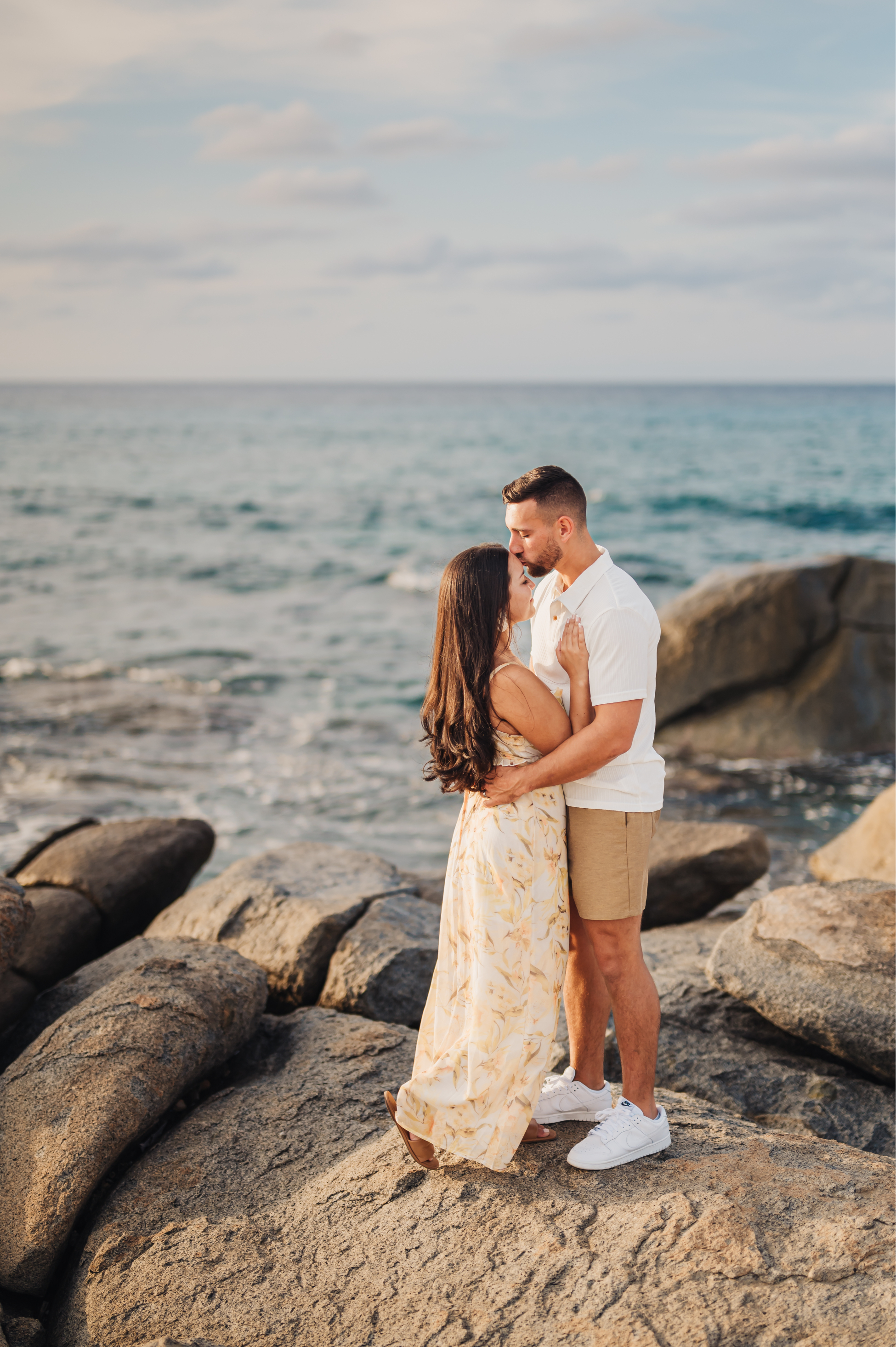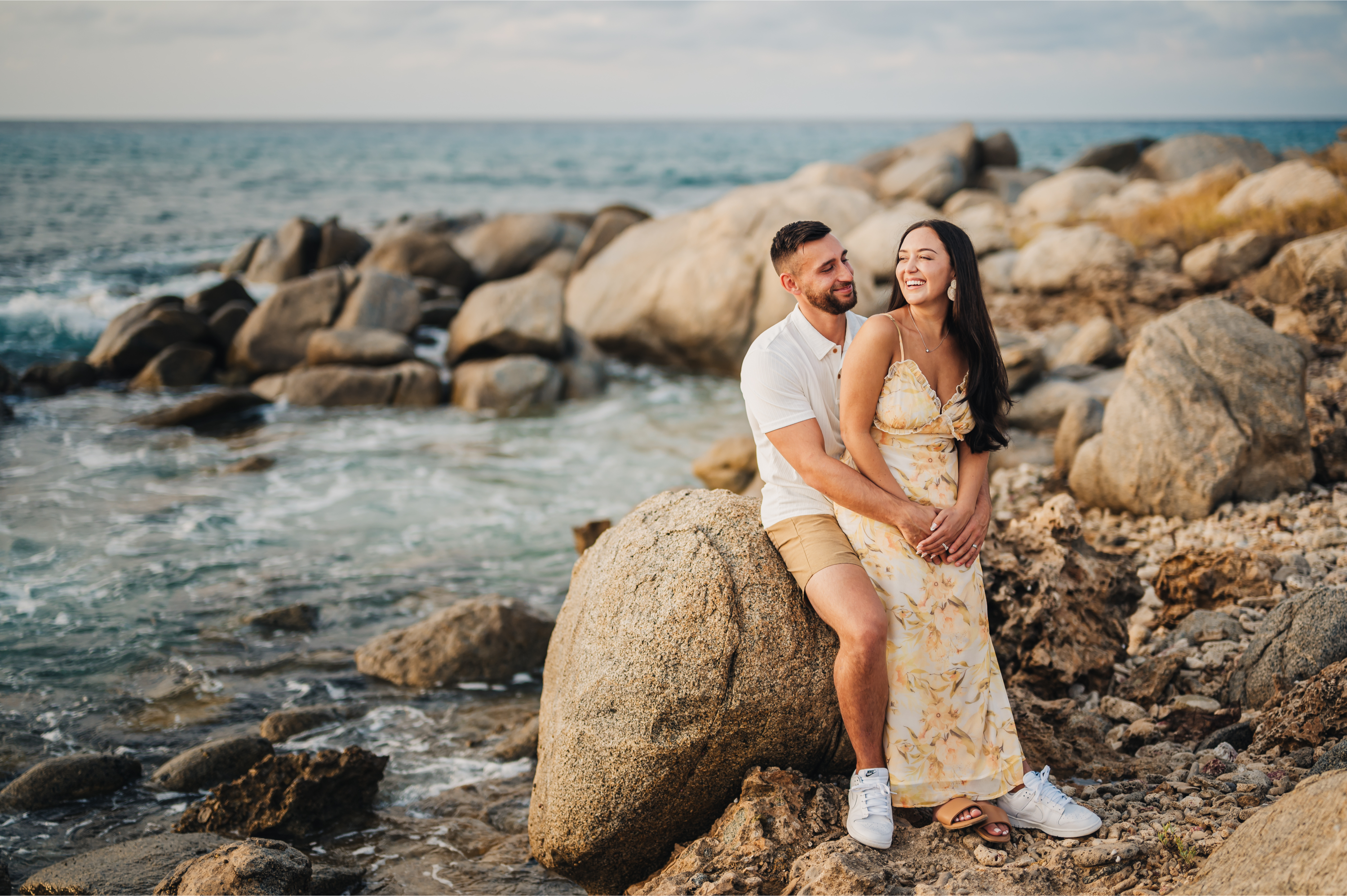 Laughter echoed through the air as we navigated the rocky landscapes, freezing moments of joy and connection against the golden hues of the setting sun. But the real magic happened at Arashi Beach – a favorite canvas for our lens. The blend of white sands and scattered rocks provided the ideal canvas for their love story, beautifully contrasting with the vibrant sunset.